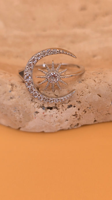 Bague réglable en argent sterling 925. Lune et étoile scintillante.
