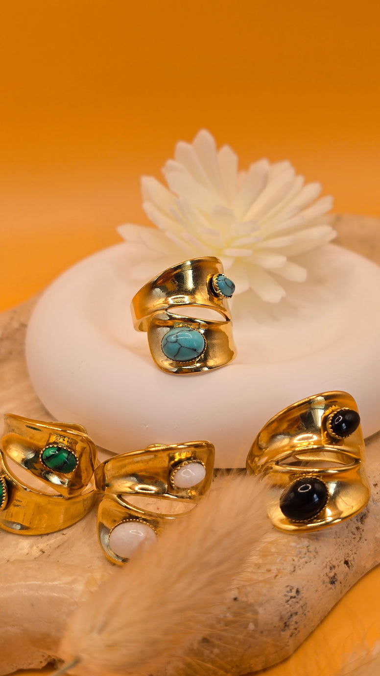 Apportez une note de fraîcheur et d'originalité à vos looks avec cette bague dorée en acier inoxydable 316 L. Son design incrusté est orné de deux pierres naturelles bleues. Elégante, résistante et intemporelle, elle s'adapte aussi bien aux tenues quotidiennes qu'aux occasions spéciales.