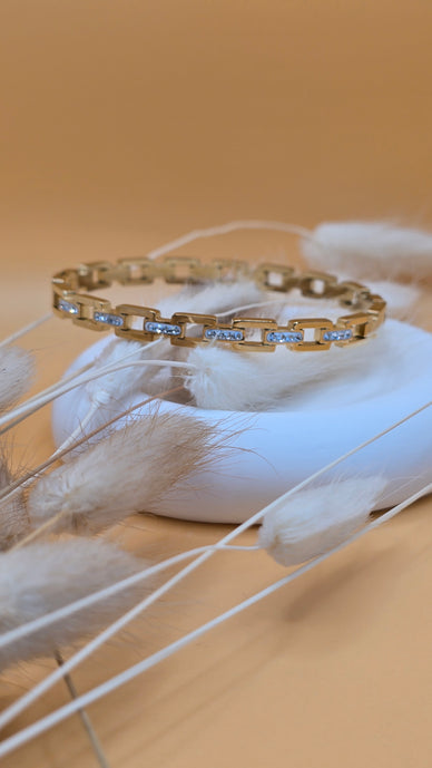 Ce bracelet doré en acier inoxydable 316L allie élégance et sophistication avec son design géométrique orné de zircons scintillants. Chaque maillon reflète la lumière avec éclat, offrant un rendu à la fois moderne et raffiné.