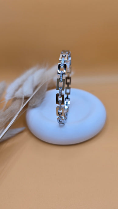 Élégant et raffiné, ce bracelet en acier inoxydable 304L séduit par son design géométrique et sa brillance exceptionnelle. Les maillons polis, rehaussés de petits zircons étincelants, apportent une touche de luxe discrète et moderne à votre poignet.
