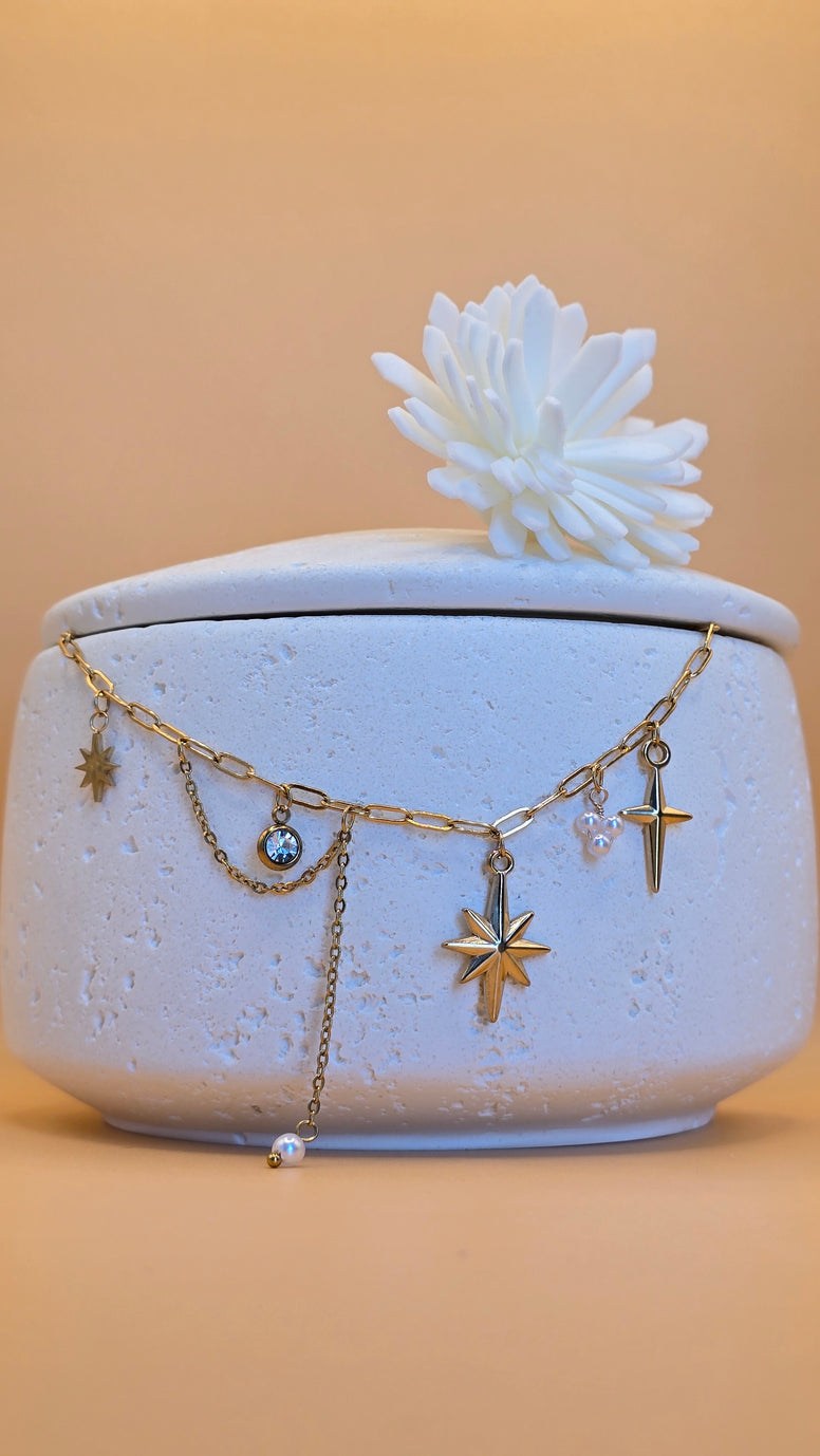 Illuminez votre décolleté avec ce collier doré en acier inoxydable décoré de pendentifs étoilés, croix et perles nacrées. Inspiré du ciel nocturne, il apporte une touche à la fois douce et sophistiquée à toutes vos tenues. Résistant à l'eau et à l'oxydation, il garde tout son éclat sans noircir.