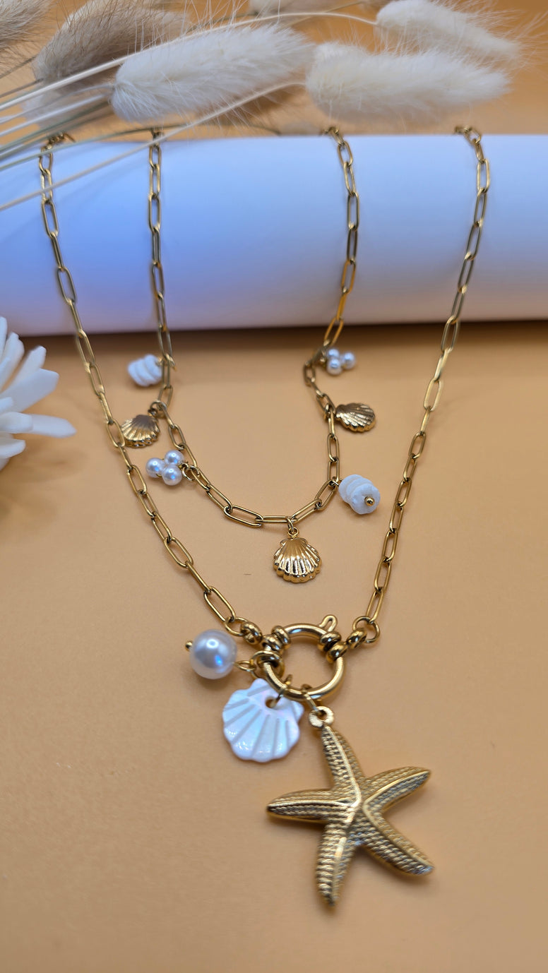 Apportez une touche estivale et raffinée à vos tenues avec ce duo de colliers tendance en acier inoxydable 316 L doré, résistant et hypoallergénique. Ce lot est composé de deux chaînes distinctes : un collier orné de pendentifs coquillages et perles nacrés pour un style délicat et marin et un collier plus long sublimé par une étoile de mer doré accompagnée d'un coquillage blanc et d'une perle, pour un rendu élégant et original.