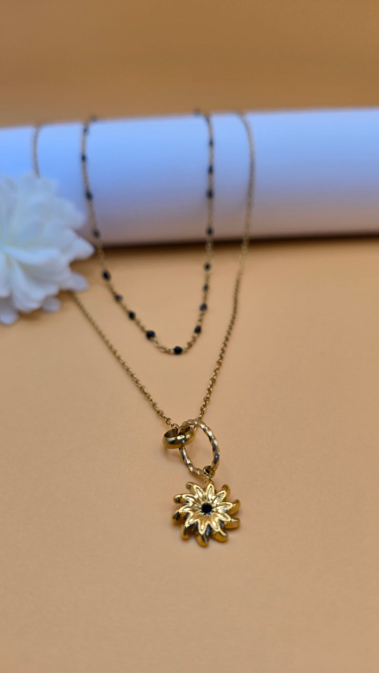 Duo de colliers dorés. Pendentif fleur et perles noires. Acier inoxydable 316 L.