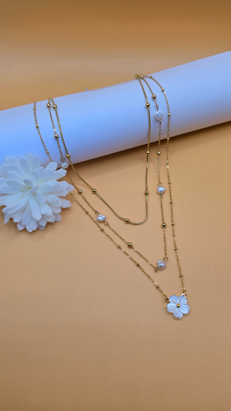 Lot de 3 colliers fleurs et perles. Acier inoxydable 316.